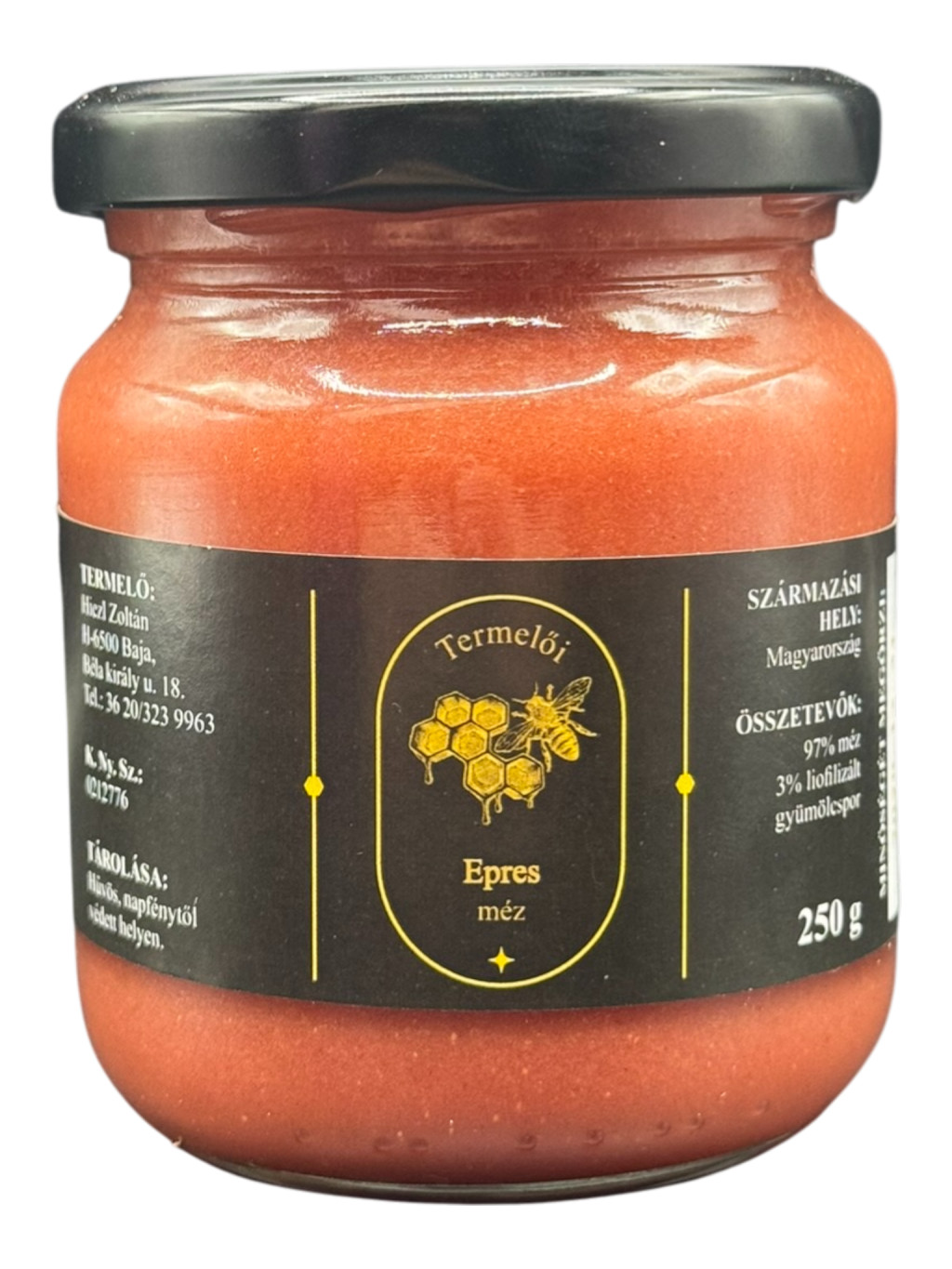 A termék alapja repceméz, amelyet liofilizált (fagyasztva szárított) eperporral készítettünk. Ez a technológia megőrzi a gyümölcs vitaminjait és ízét.